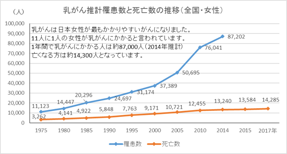 乳がん罹患数、死亡数の推移(全国・女性)