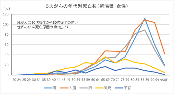 新潟県の女性 5大がんの年代別死亡数
