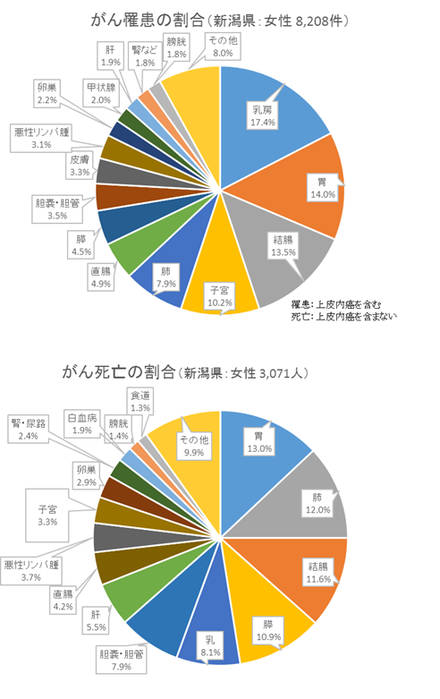 新潟県の女性 がん別罹患・死亡の割合