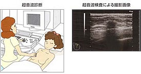 乳房に超音波をあて、組織からの反射をとらえて画像にし、わずかな濃度の違いで病巣を診断するもの。 マンモグラフィに比べて小さいシコリや石灰化の診断が困難ですが、シコリの内部構造の鑑別がしやすく、乳腺の密な若い 人や放射線被爆を避けたい妊娠中の方、乳房圧迫の痛みに耐えられない方などに適しています。