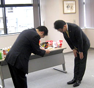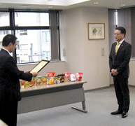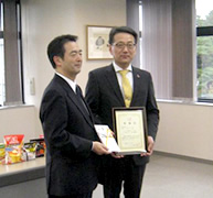 清水商事(株)からは、今年3、7、10月の3か月間、メーカー4社と協力した対象商品の売上金額の1%として、10万円を寄附いただき、佐藤代表からは感謝状を贈呈しました。