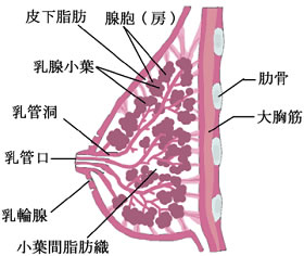 大人の女性の乳房は、乳頭を中心に乳腺が放射状に15~20個並んでいます。それぞれの乳腺は「小葉」に分かれ、小葉は「乳管」という管でつながっています。 乳がんの約90%はこの乳管から発生し、「乳管がん」と呼ばれます。小葉から発生する乳がんが約5~10%あり、「小葉がん」と呼ばれます。乳管がん、小葉がんは、乳がん組織を顕微鏡で検査(病理学的検査)すると区別できます。この他に特殊な型の乳がんがありますが、あまり多いものではありません。